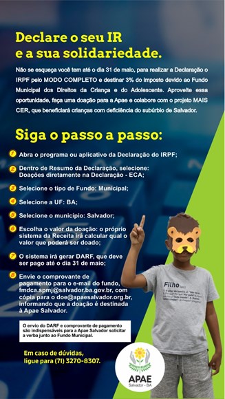 Até o dia 31 de maio, todo contribuinte que fazer a declaração pelo modo completo pode destinar 3% do imposto devido ao Fundo Municipal dos Direitos da Criança e do Adolescente (FMDCA), sem afetar o valor da restituição. Esta é uma oportunidade de ajudar a Apae a ampliar os serviços de humanização do Centro Especializado em Reabilitação, no bairro de Coutos, por meio do projeto Mais CER, que auxiliará na reabilitação de crianças e adolescentes do subúrbio de Salvador.